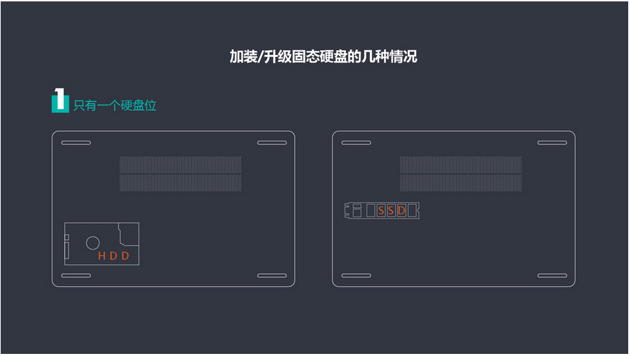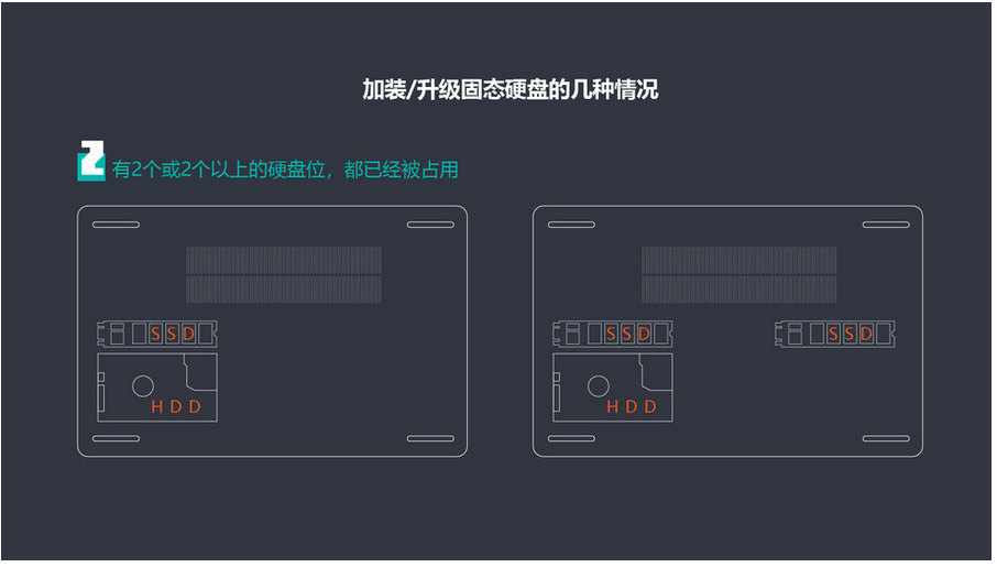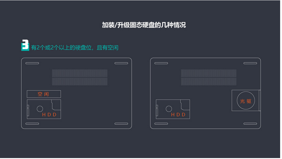 第三种情况,笔记本有2个或2个以上的硬盘位,且有空闲的插槽。比如一些产品虽然只标配了一个机械硬盘,但是预留了M.2固态硬盘位,我们可以直接加装,包括一些老的笔记本虽然没有固态硬盘位,但是有光驱,我们可以将光驱拆除,在光驱位加装固态硬盘位。