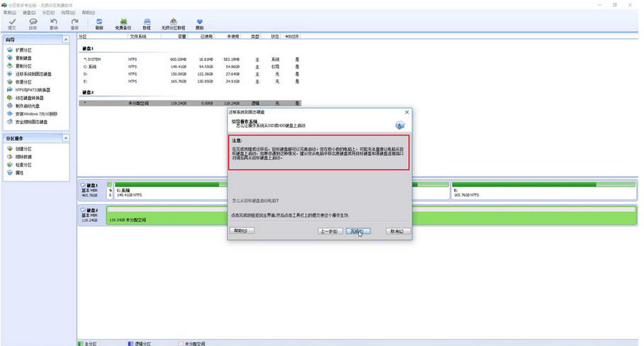 4、点击下一步,这里可以看到一个注意提示。它说明意思是,完成迁移后,一般我们在BIOS中将新安装的固态设置为启动盘就可以了,但是有少数机器即使更改了启动选项,依然会从老硬盘引导启动,这时我们可以先将老硬盘拆除掉,让机器从新硬盘启动一次或者几次,再将老硬盘装回就可以了。