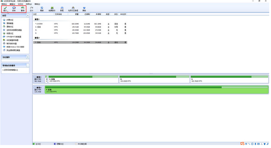 5、点击完成,可以看到新硬盘从未分配变为了系统,但是这时并没有完成系统的迁移,注意看软件的左上角,需要点击提交来完成操作,当然也可以点击放弃或撤销重新操作。确认无误点击提交,根据提示操作即可。随后电脑会自动重新,真正进入系统迁移的过程,等待一段时间后,迁移完成电脑自动重启。由于没有更改启动项,电脑还是会从老硬盘启动,手动再次重启更改BIOS中的启动盘就可以了。