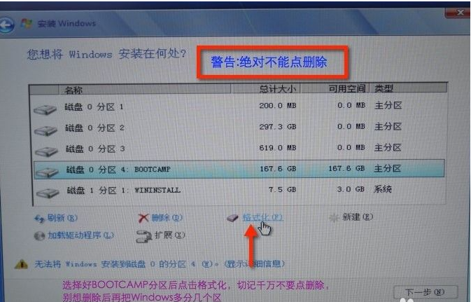7、此时选择BOOTCAMP分区,点击驱动器选项(高级),选择好BOOTCAMP分区致后点击格式化,记住千万不要点删除,别想删除之后再把Windows多分几个区。