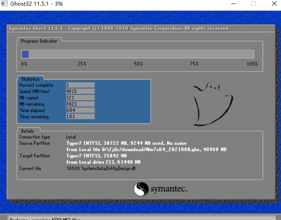 4、重启系统后,系统会默认进入PE环境,然后系统将会自动进行备份还原。