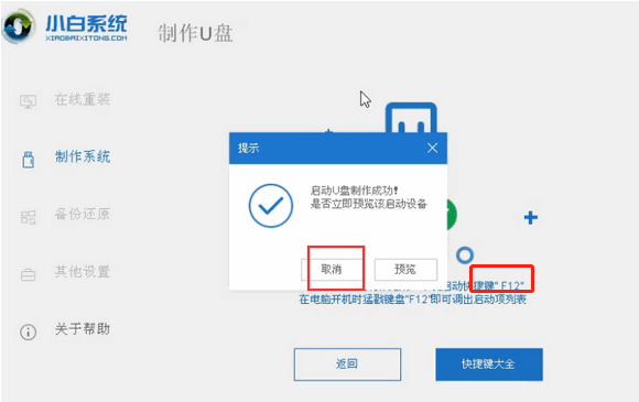 步骤三:系统下载完成,U盘启动盘制作成功之后,单击提示中的取消,制作完成后单击快捷键,记住启动热键,见下图,查看快捷键大全就可以了,最后拔掉U盘。