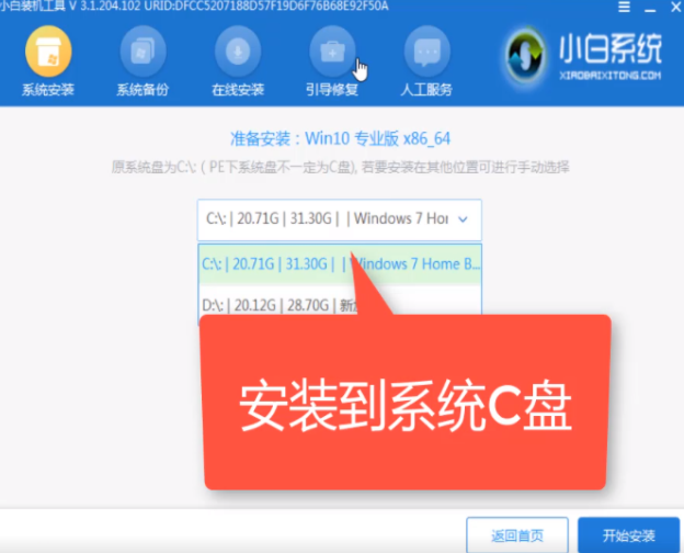 步骤七:接下来选择C盘,点击开始安装。再等待win10系统安装完成后,即可拔掉U盘,重启电脑。
