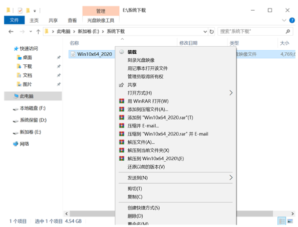 步骤2:解压所下载的“Win10x64_2020”镜像,鼠标右键“解压文件(A)”。
