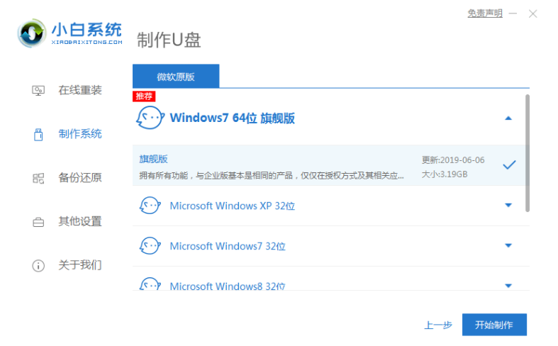 2、选择我们自己需要安装的win7系统,点击开始制作。