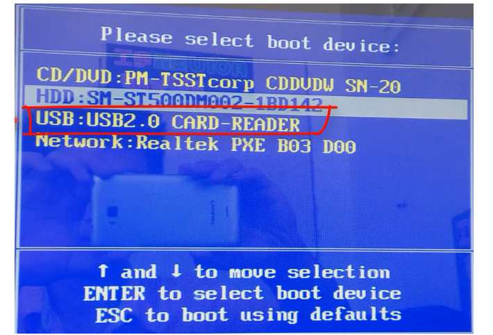 4、接着我们将u盘启动盘插入需要重新安装的电脑usb接口上,开机时不断地按下启动快捷键进入快速启动页面,选择带USB开头的u盘启动项按返回键进入即可。