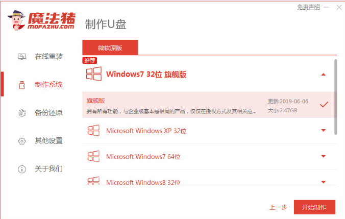 2、接着我们将U盘插入电脑,点击开始制作,选择我们需要下载的xp系统镜像。