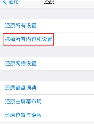 2、在通用界面下点击还原,选择还原里面的“抹掉所有 内容和设置”。