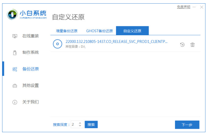 2、下载安装小白一键重装系统工具到电脑上,然后打开,选择左栏的备份还原,点击自定义还原进入下一步。