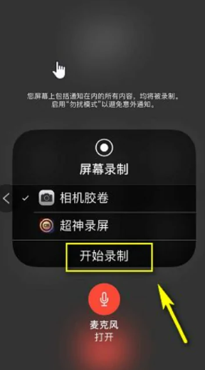 3、然后控制中心按住录制屏幕不放手,不放手,按住3S,如下图所示。